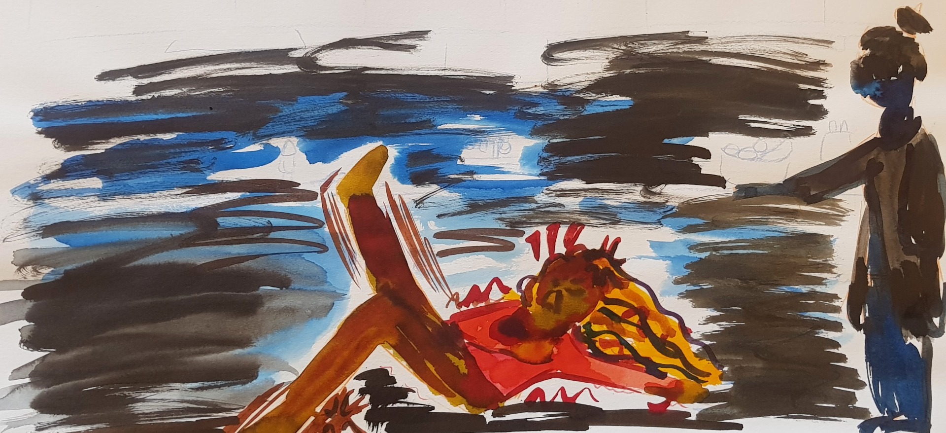 De opdracht was om een momentopname van een gebeurtenis die je die week had meegemaakt te tekenen. In deze week had mijn lichaam al aangegeven dat ik rust moest nemen, maar ik had het genegeerd. Hierdoor kreeg ik een soort spastische aanval (waar ik wel vaker last van heb) en lag ik op de grond. Het meisje in het rood ben ik zelf en het rood staat voor alle spanning die op dat moment door m'n lichaam ging. Mijn hand licht op m'n borst, wat aangeeft dat ik geen lucht heb. De kronkel lijnen op me heen geven aan dat mijn lichaam veel bewoog. De schim naast mij is de persoon die probeerde een vorm van hulp aan te bieden, maar weinig kon doen, daarom is deze ook zwart met donkerblauw zoals de achtergrond. De achtergrond had eerst nog een keuken, maar die is uiteindelijk bedekt met zwarte en blauwe ecoline, omdat de wereld om me heen vervaagd tijdens een aanval.