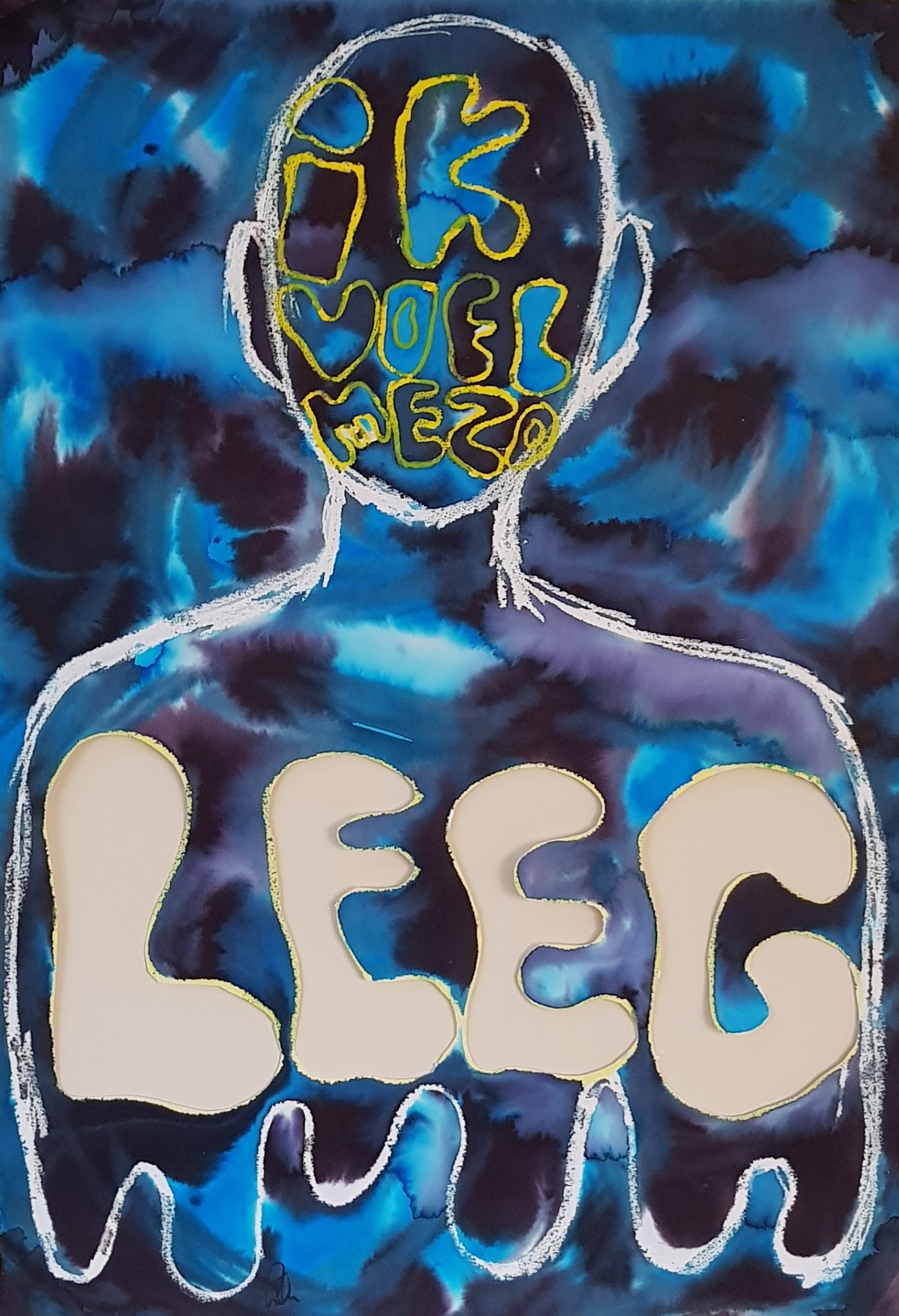 stappen in proces: Ik heb eerst een kleine schets gemaakt voor de vorm van de persoon en waar ik de tekst wilde hebben staan. Toen ik hier tevreden mee was heb ik het op A2 verwerkt. Eerst heb ik de vormen met witte wasco getekend en de tekst met geel. Vervolgens heb ik het papier nat gemaakt en de ecoline met een druppeltechniek erop laten vallen. De ecoline ging hierdoor zichzelf verspreiden over het papier. Ik heb dit ook gedaan met een een meet donkerblauw/paarse kleur gedaan en een werk met allebei door elkaar. Ik was toch niet tevreden met hoe de tekst om de figuur heen liep en probeerde het daarna meer te verwerken in het hoofd van het figuur. De tekst had hierdoor ook meer connectie met waar depressie vandaan komt (het brein) en viel ook meer op.